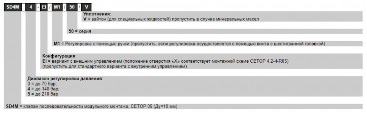 Гидроклапаны SD4M4/50, SD4M5/50, SD4M3/50, а также их версии с регулировкой рукояткой (SD4M4/M1/50, SD4M5/M1/50, SD4M3/M1/50) представляют собой последовательные клапаны прямого действия золотникового типа в модульном исполнении, с монтажной поверхностью по стандартам CETOP и ISO.