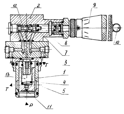 Масло из системы (Р) поступает через дроссель 11 в основном клапане по каналу 12 к игле 7 вспомогательного клапана. Пока давление в системе, воздействующее на иглу 7, не превышает настройку пружины 8, клапан 4 остается прижатым к седлу пружиной 5. Когда давление повышается, игла 7 открывает канал 12, и масло из надклапанной полости 13 поступает на слив (Т). В результате равновесие сил на клапане 4 нарушается, и он поднимается под действием перепада давления на дросселе 11, соединяя линию давления Р с линией слива Т. Как только давление в системе становится ниже настроенного значения пружины 8, вспомогательный клапан закрывается, давление на клапане 4 уравновешивается, и клапан снова прижимается к седлу усилием пружины 5.