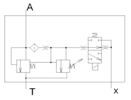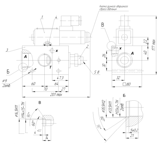 Клапан предохранительный с электромагнитным управлением типа ГКЕР20.32 с условным проходом 20 мм состоит из корпуса со встроенным в него предохранительным клапаном непрямого действия и гидрораспределителя типа 1РЕ6... с различным вариантами управляющего напряжения: 12 вольт постоянного тока, 24 вольта постоянного тока, 110 вольт переменного тока и 220 вольт переменного тока. Настройка заданной величины давления осуществляется при помощи регулировочного винта.