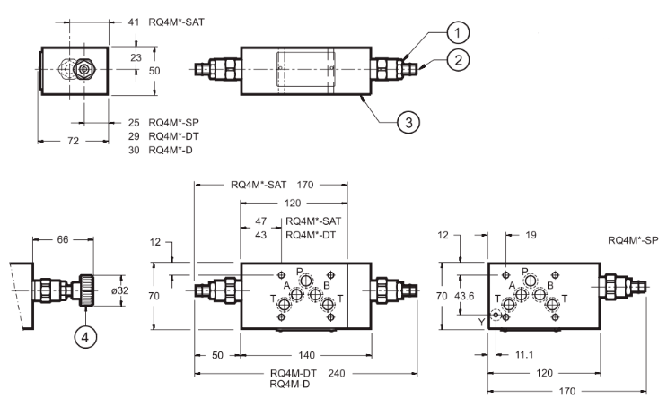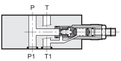 - Конфигурация «SP»: клапан RQ4M-3 (4,5,6)-SP контролирует давление в магистрали P со сбросом в T.