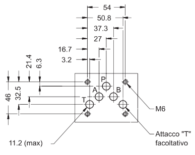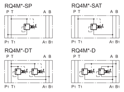 - Конфигурация «DT»: клапан RQ4M-3 (4,5,6)-DT контролирует давление в магистралях A-B со сбросом в T.
