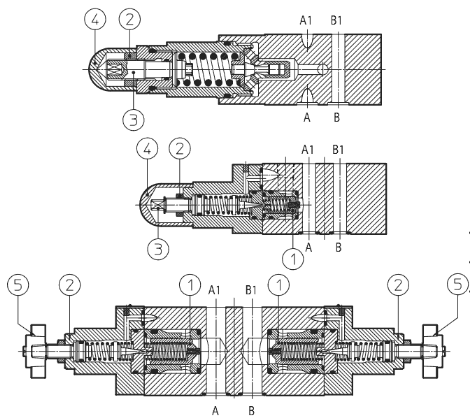 Для настройки давления необходимо ослабить контргайку 2 и повернуть винт 3, который закрыт колпачком 4. По запросу клапан может быть оснащен рукояткой 5 вместо винта 3. Вращение по часовой стрелке увеличивает давление.