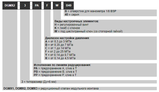 Гидроклапаны DGMX2(1,3)-3-PA-F(A,B,C,Y,R)W-B40, DGMX2(1,3)-3-PB-F(A,B,C,Y,R)W-B40 и DGMX2(1,3)-3-PP-F(A,B,C,Y,R)W-B40 представляют собой редукционные клапаны модульного исполнения с монтажной поверхностью, соответствующей стандартам CETOP 03 и ISO (с диаметром Ду=6 мм).