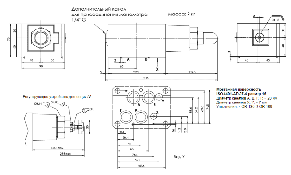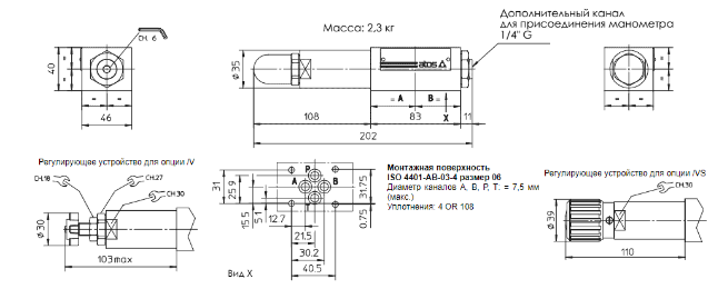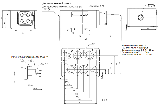 По запросу доступна версия с регулировочной рукояткой (5). Вращение рукоятки по часовой стрелке увеличивает давление. Монтажная поверхность клапана соответствует стандарту ISO 4401.