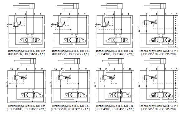 Редукционные гидроклапаны золотникового типа серий HG, KG и JPG предназначены для поддержания и снижения давления в гидросистеме до заданного уровня.