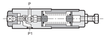 На золотник воздействует давление из магистрали P с одной стороны и регулировочная пружина с другой. Когда давление в магистрали P превышает установленное значение, клапан закрывается до тех пор, пока давление в P (пониженное) не достигнет заданного уровня.