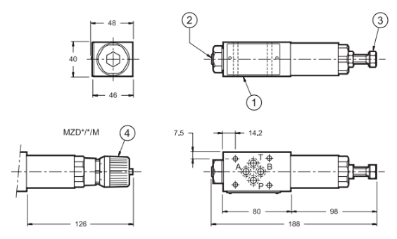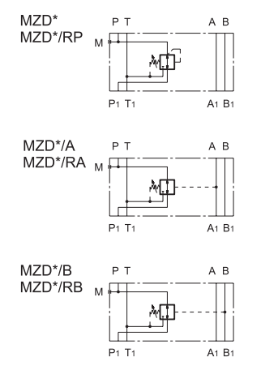 - MZD*/A и MZD*/RA: снижение давления в магистрали A перед исполнительным механизмом и максимальное давление в магистрали B, дренаж соединен с магистралью T.