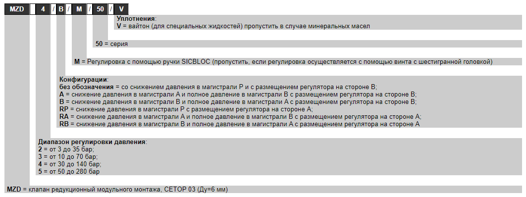 - MZD*/B и MZD*/RB: снижение давления в магистрали B перед исполнительным механизмом и максимальное давление в магистрали A, дренаж соединен с магистралью T.
