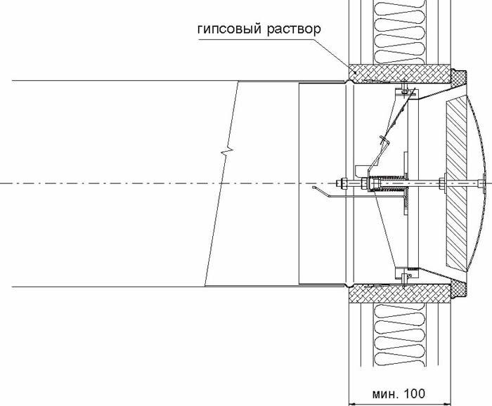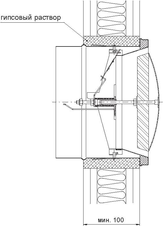 Зазор между диаметром в свету строительного отверстия и установленной втулкой клапана заполняют гипсовым раствором или гипсом. Для уплотнения отверстия под клапан в пожарной перегородке недопустимо пользоваться пенообразующими материалами.