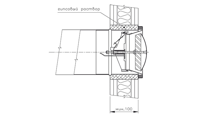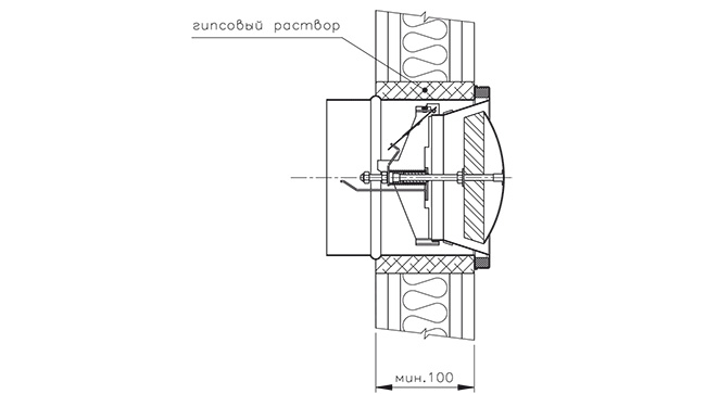 Клапаны устанавливаются в гипсокартоновые стены толщиной мин. 100 мм, жесткие конструкции стены толщиной мин. 100 мм, или в жесткие конструкции перекрытия толщиной мин. 150 мм. Зазор между диаметром в свету строительного отверстия и установленной втулкой клапана заполняют гипсовым раствором или гипсом. Для уплотнения клапана в пожарной перегородке нельзя использовать пенообразующие материалы.