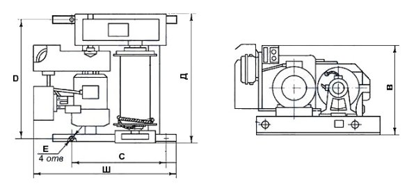 При остановке работы тормозная система с гидроприводом прижимает тормозные колодки к шкиву, предотвращая вращение входного вала редуктора.