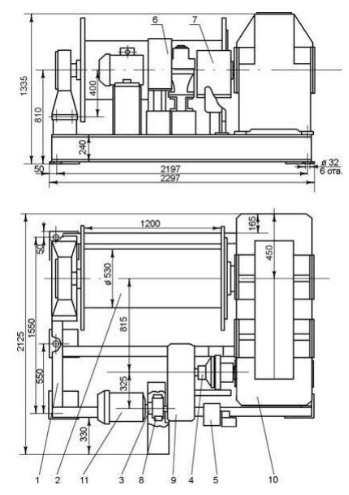 Оборудование включает стандартные компоненты, характерные для тяговых лебёдок: