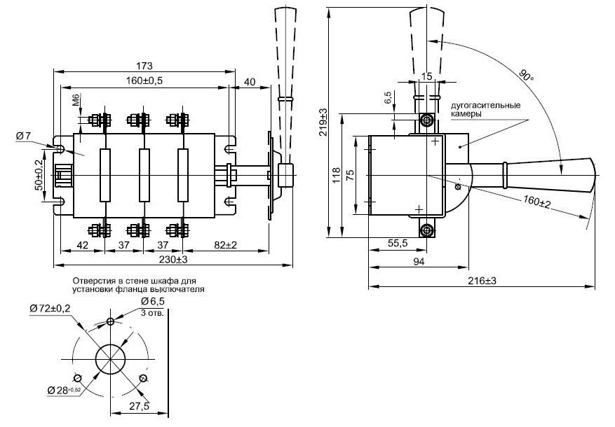 Габаритные размеры выключателя врубного лифтового специального ВВЛС ДУС3.602.005