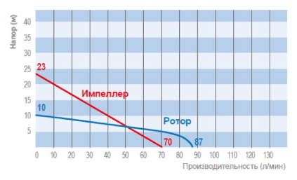 - Высота подачи (макс.): до 10 м (Ротор); до 23 м (Импеллер).