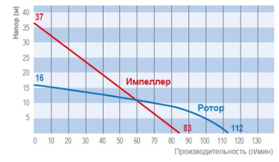 - Высота подачи (макс.): до 16 м (Ротор); до 37 м (Импеллер)