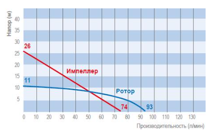 - Высота подачи (макс.): 11 м (ротор) ; 26 м (импеллер)