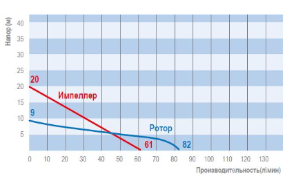 - Высота подачи (макс.): до 9 м (Ротор); до 20 м (Импеллер)