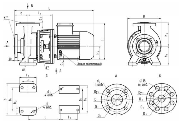 - Привод: электродвигатель специальной конструкции с удлиненным концом вала. Корпусные элементы насоса закреплены на фланцевом щите двигателя.