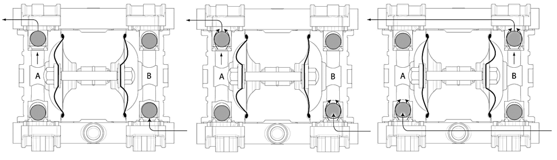 Когда диафрагма (А) под давлением достигает конца такта, клапан распределения переключается, диафрагма (B) начинает работать в стадии давления и диафрагма (A) — в стадии разрежения. Когда насос достигнет исходной точки отсчета, то каждая диафрагма проведет один ход, выдавливающий жидкость и один ход, нагнетающий разрежение. Эта последовательность движений составляет один полный цикл.