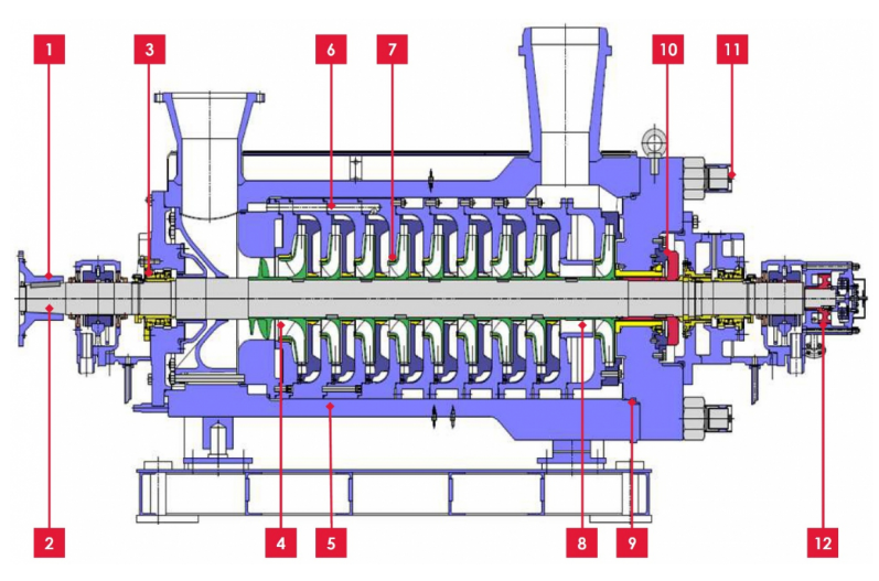 Насосы центробежные, горизонтальные, двухкорпусные, с многоступенчатым секционным внутренним корпусом, с последовательным расположением рабочих колес, с гидравлической пятой, с подшипниками скольжения с принудительной смазкой, концевыми уплотнениями торцевого типа.