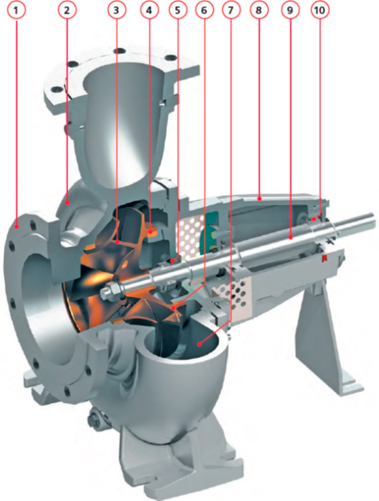 - Конструкция корпуса с выемной роторной частью и съёмным кронштейном подшипникового узла позволяет проводить техническое обслуживание без демонтажа корпуса насоса и подводящих трубопроводов.