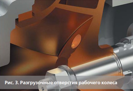 - Рабочее колесо разгружено от осевых сил с помощью специальных разгрузочных отверстий на заднем диске колеса для снижения нагрузки на подшипники и увеличения их срока службы (Рис. 3).