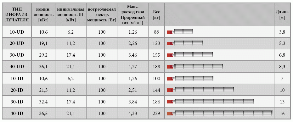 Активной поверхностью являются трубы диаметром 102 мм или 127 мм, внутри которых происходит сжигание газа и по которым проходит поток продуктов сгорания к устью вытяжного вентилятора. Излучатели “HELIOS” производятся с отопительной трубой в форме: