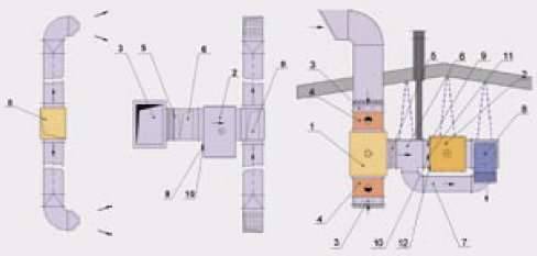 Оборудование включает кроме газового обогревателя, вентилятор с двигателем, фильтр EU3, регулировочные клапаны байпасы и байпас. Тепловоздушный агрегат – это газовое оборудование с электронно-управляемым розжигом и принудительным отводом продуктов сгорания.