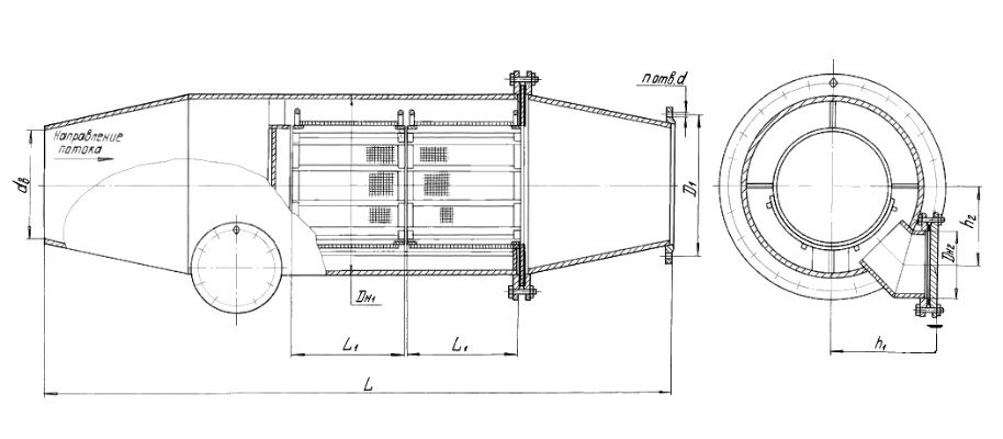 Грязевик представляет собой цилиндрический корпус с фланцевым, либо под сварку, соединением трубопровода теплоснабжения, водоснабжения и фильтрацией воды специальной сеткой произведенной из нержавеющей стали 12Х18Н10Т.