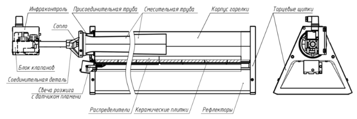 В корпусе горелки расположены распределители с перфорированными керамическими плитками, закрепленными через уплотнительные прокладки. Для надежной фиксации плиток применяются двойные планки с болтовыми соединениями, а также защитные сетки из жаростойкого сплава, предотвращающие выпадение элементов при их разрушении. К корпусу горелки крепятся торцовые щитки, которые соединены с отражателями. Все элементы излучателя выполнены из термостойкого металла.
