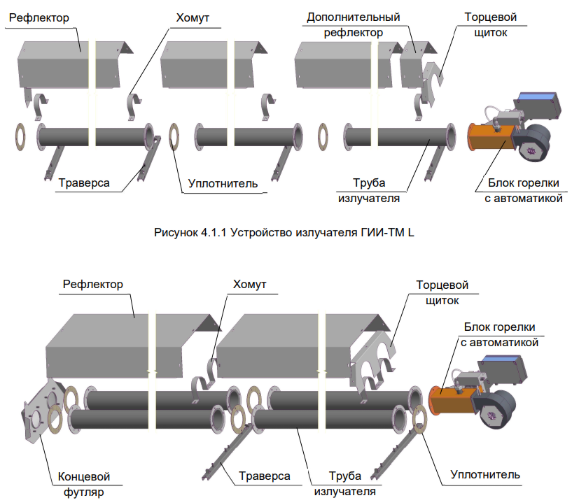 Горелки на всех излучателях одинаковы и отличаются только номинальной мощностью, подробнее про горелку описано в соответствующем разделе данного РЭ.