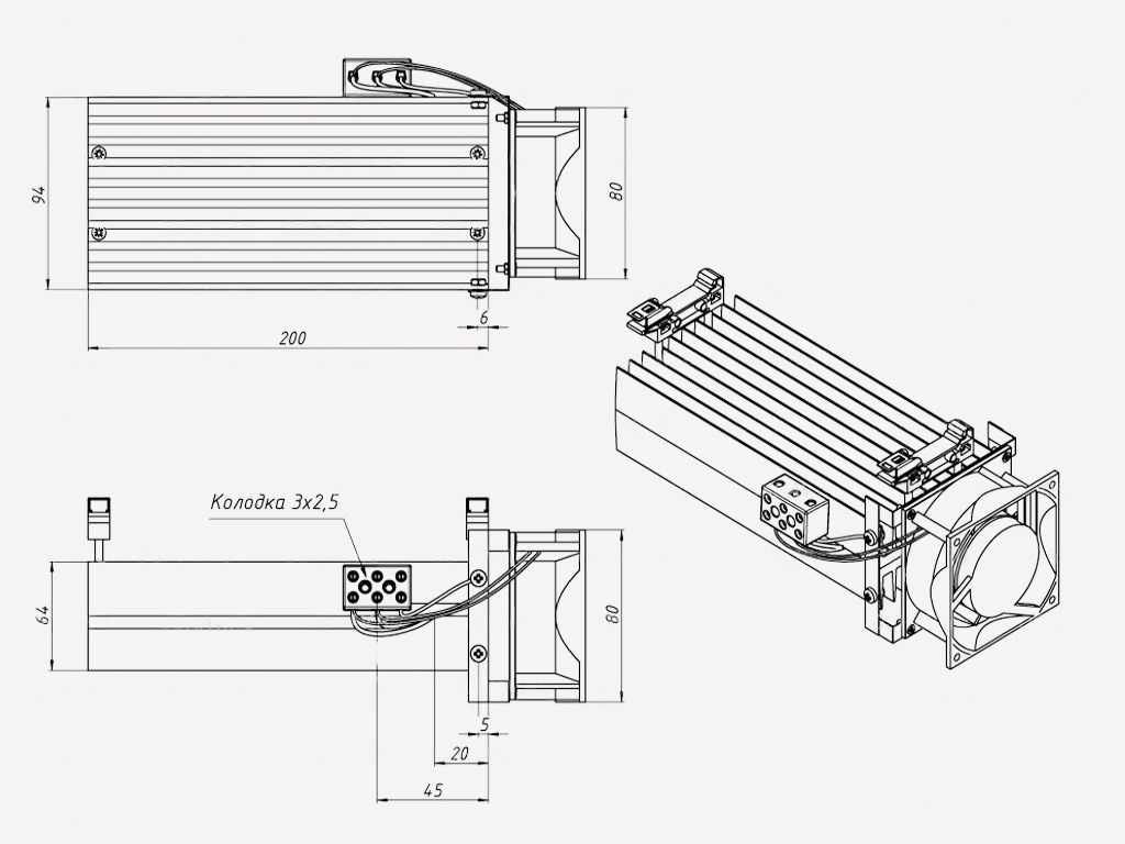Нагревательный элемент резистивного типа с минеральной изоляцией устанавливается в пазе алюминиевого профиля (радиатора) и накрывается другой частью радиатора. Токоподвод осуществлен через термостойкие провода в стекловолоконной оплетке покрытой силиконом, места соприкосновения с металлом дополнительно изолированы стекловолоконной трубкой. Корпус обогревателя заземлен, контакт заземления выведен на клеммную колодку. На клеммной колодке подписаны контакты для корректного подключения: L – фазный провод, N- провод нейтрали, ¥ - заземление. Под заказ возможен другой тип подключения с кабельным выводом термостойким проводом в металлической оплетке.