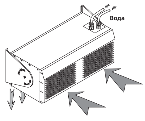 Воздушные завесы выпускаются в конструктивном исполнении пригодном как для горизонтальной, так и для вертикальной установки. Воздушный поток, формируемый тремя или пятью равномерно распределенными вентиляторами, проходя между пластинами водяного теплообменника (воздухонагревателя), нагревается до заданной температуры и через прорези в корпусе завесы направляется в плоскость защищаемого проема.