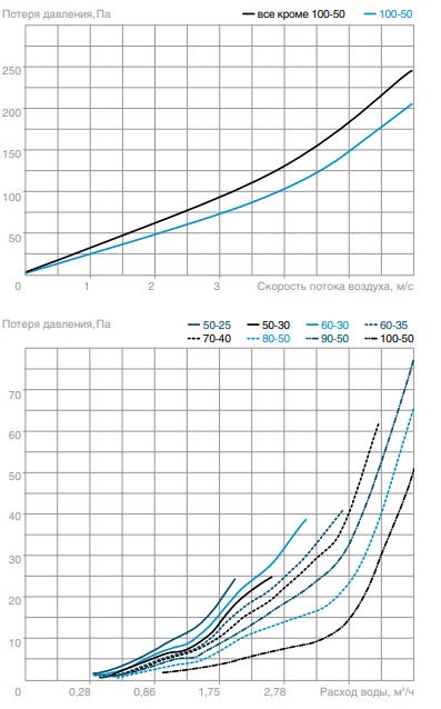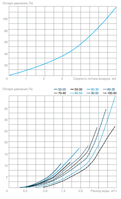 Типоразмер | Расход воздуха, м3/ч | Расход воды, м3/ч | Гидравлическое сопротивление, кПа | Теплопроизводительность, кВт |