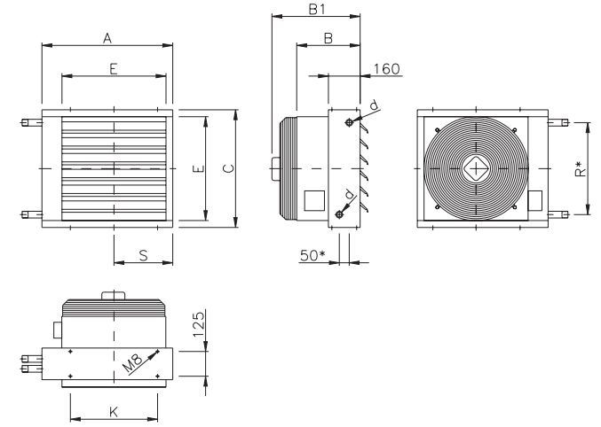 Предназначены для монтажа на стену или под потолком. Выпускаются мощностью от прибл. 8,7 кВт do 80 кВт (с производительностью по воздуху от 1500 до 7800 м3/ч).