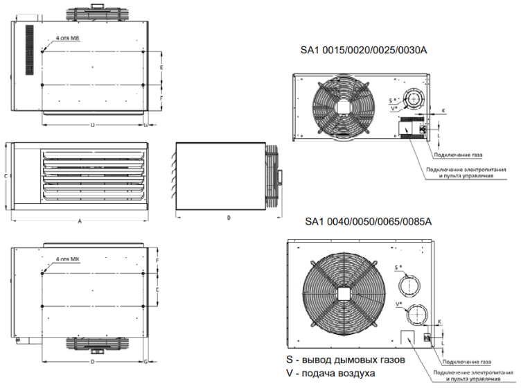 Модель воздухонагревателя | A | B | C | D | E | F | G | K | L | Ø S | Ø V | Подвод газа |