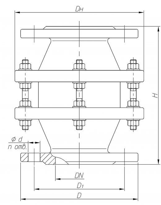 Присоединительные размеры, мм | D D1 d n | 160 125 18 4 | 195 160 18 8 | 215 180 18 8 | 280 240 22 8 | 335 295 22 12 | 405 355 26 12 | 460 410 26 12 | 520 470 26 16 | 710 650 33 20 |