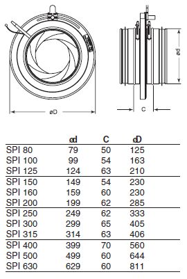 Ирисовая диафрагма открывается полностью, поэтому не требуется сервисная дверца для проведения чистки. Выпускаются клапаны типоразмеров диаметром 100-630. Максимальная рабочая температура SPI: 70 °С.
