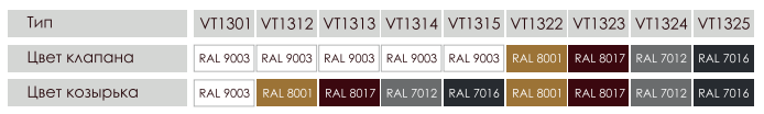 Имеются различные цвета для клапана / акустической проставки / козырька под рольставни / обычного козырька в соответствии с палитрой RAL.