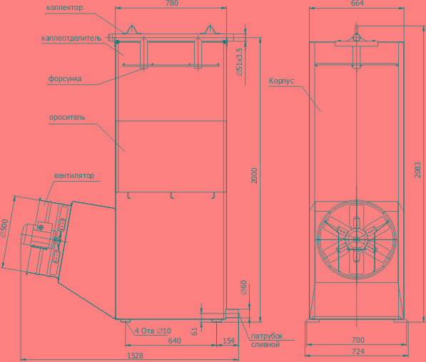 Вентиляторные пленочные градирни ГРАД - 8 изготавливаются с корпусом из нержавеющей стали по одновентиляторной схеме с нижним расположением вентилятора.