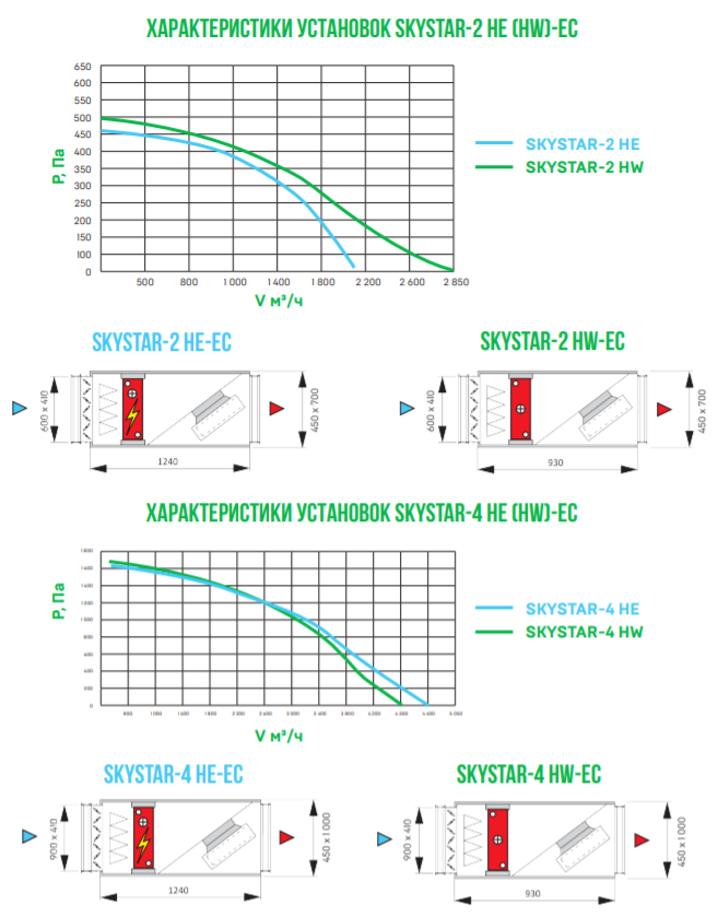 Установки SkyStar-HE(HW)-EC выпускаются в 2 модификациях SkyStar-HE, SkyStar-WH с электрическим и водяным нагревателями соответственно. Нагреватели рассчитаны на нагрев воздуха от - 35ºС до + 18ºС при максимальной производительности вентилятора.