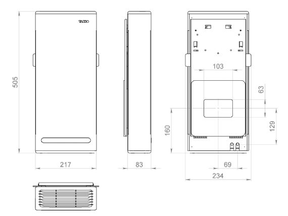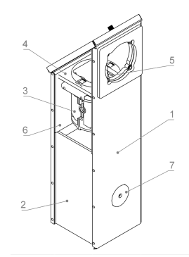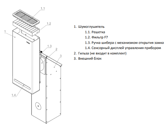 Внешний блок предназначен для монтажа на наружную стену помещения. Внешний блок представляет собой теплоизолированный корпус из окрашенной полимерной краской стали, внутри которого размещен вентиляционный блок и теплообменник-регенератор. Окраска козырька устойчива к солнечному облучению и атмосферным воздействиям. На задней верхней части расположено вентиляционное отверстие с уплотнением, в нижней части демпфер и капельник, препятствующий попаданию стекающей влаги на стену.