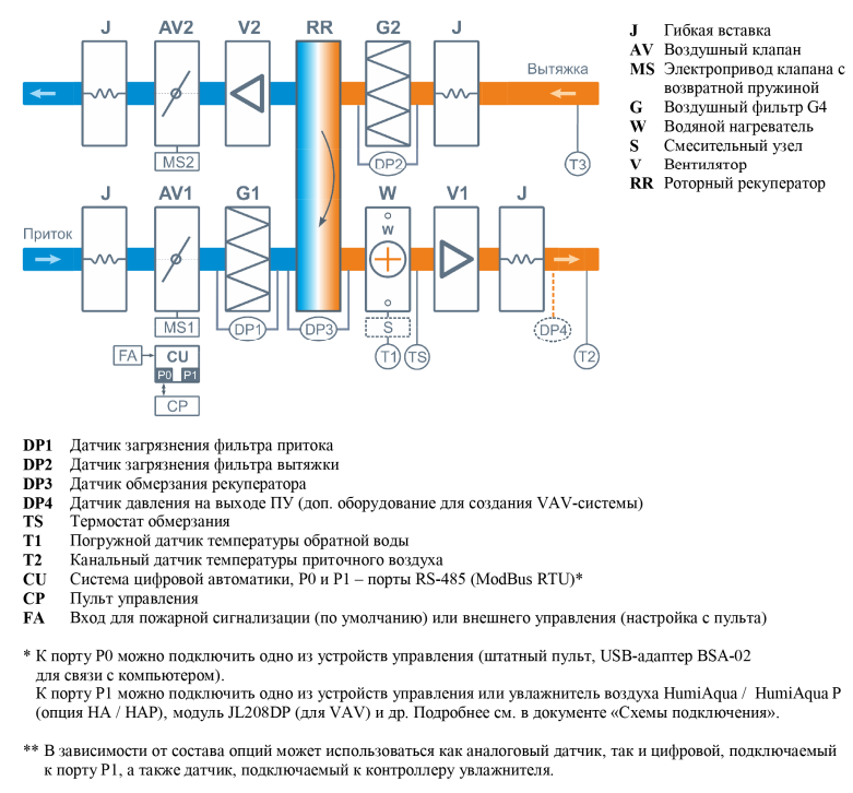 Приточно-вытяжные установки Breezart Aqua RR с роторным рекуператором, водяным нагревателем и смесительным узлом с 2-х или 3-х ходовым клапаном (узел подбирается исходя из типа теплоснабжения).