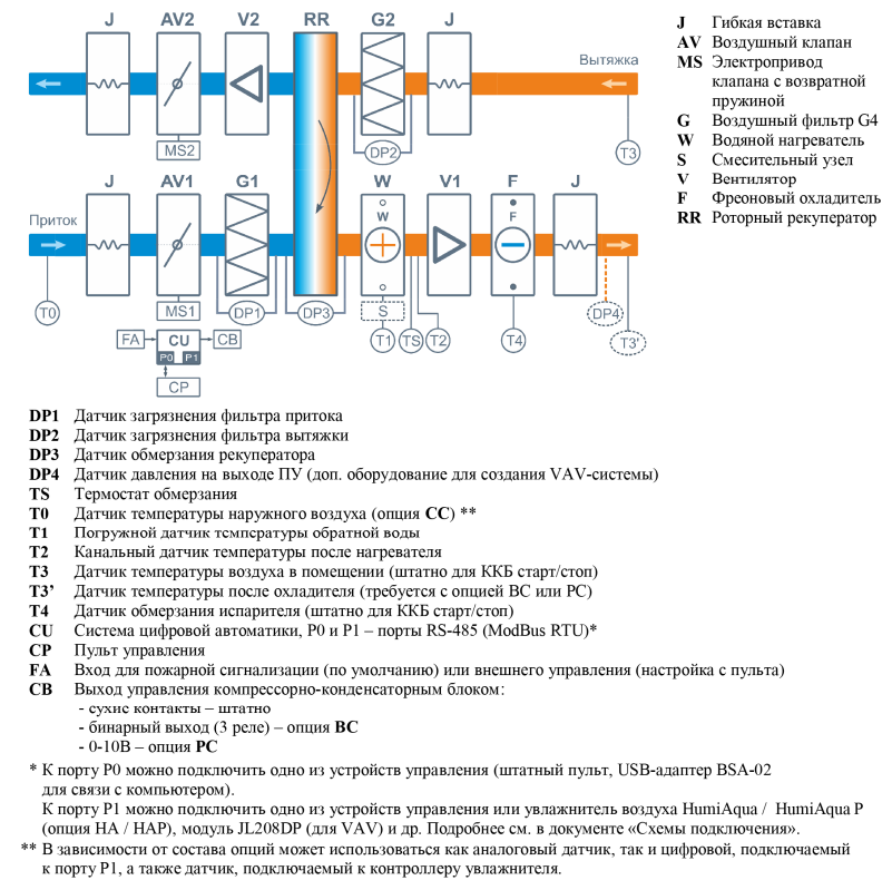 Комплектуется воздушными клапанами с электроприводом (с возвратной пружиной), системой цифровой автоматики JetLogic с цветным сенсорным пультом управления и всеми необходимыми датчиками.