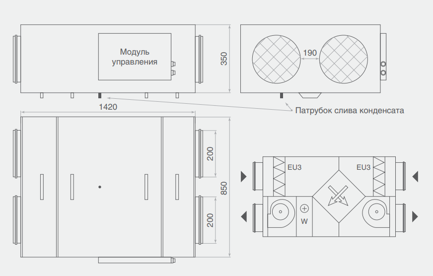 - для подсоединения к системе воздуховодов имеются один вход, один выход диаметром 200.