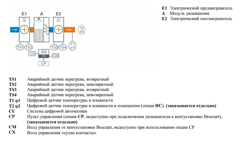 - CP – Управление увлажнителем Breezart с пульта (заказ. отдельно), вкл./выкл. по сухим контактам