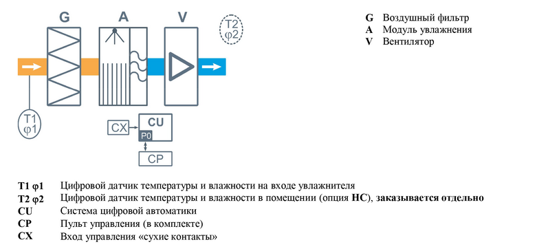 Управление только от вентустановки Breezart. Реализовано пропорциональное управление влажностью и температурой воздуха.