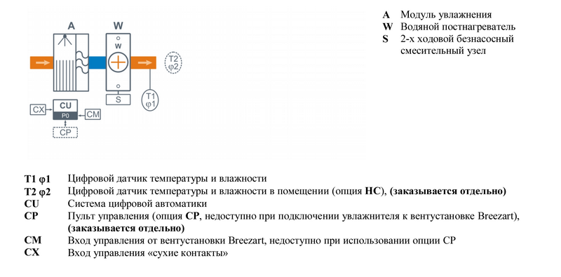 - CP – Управление увлажнителем Breezart с пульта (заказ. отдельно), вкл./выкл. по сухим контактам
