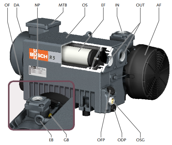 Пластинчато-роторный вакуумный насос RA 0100 F используется в цикличной или непрерывной откачке воздуха, газа и парогазовых смесей до остаточного давления 0,1 мбар (0,08 мм рт. столба) с производительностью от 0,1 до 100 м3/час.