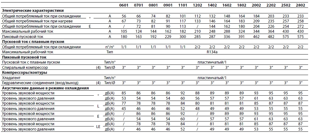 Звуковое давление измерено в свободном акустическом пространстве на расстоянии 10 м от внешней поверхности холодильной машины (по стандарту UNI EN ISO 3744).